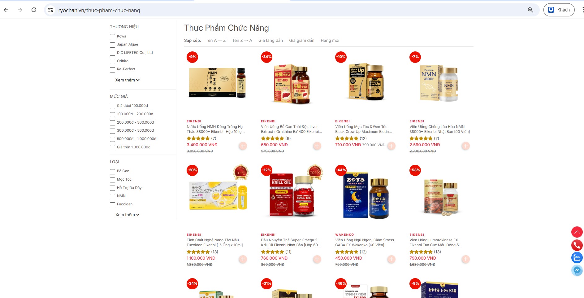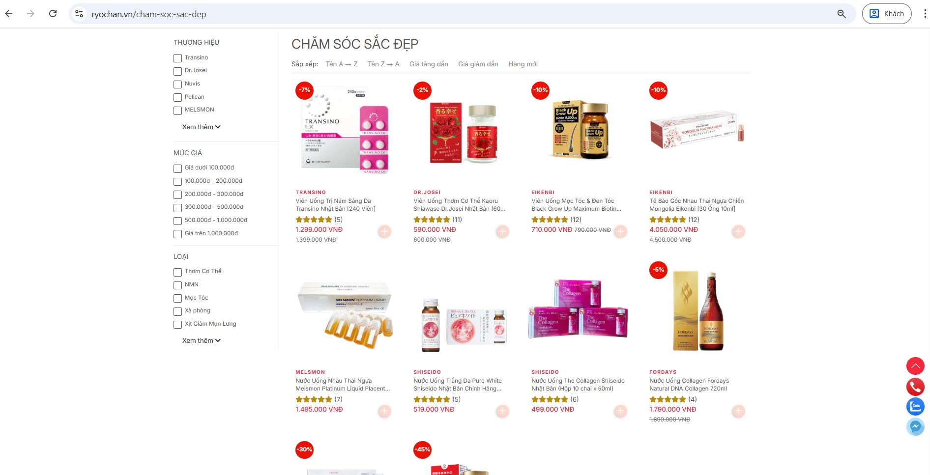 Ngành hàng thực phẩm chức năng chăm sóc sắc đẹp Nhật Bản tại Ryochan Mall mang đến các sản phẩm chất lượng cao, giúp nuôi dưỡng làn da, mái tóc và cơ thể từ sâu bên trong. Các sản phẩm được lựa chọn kỹ lưỡng như Collagen, trắng da, giảm mỡ và các sản phẩm chống lão hóa đến từ các thương hiệu Nhật Bản nổi tiếng, đáp ứng các tiêu chuẩn chất lượng cao nhất.
