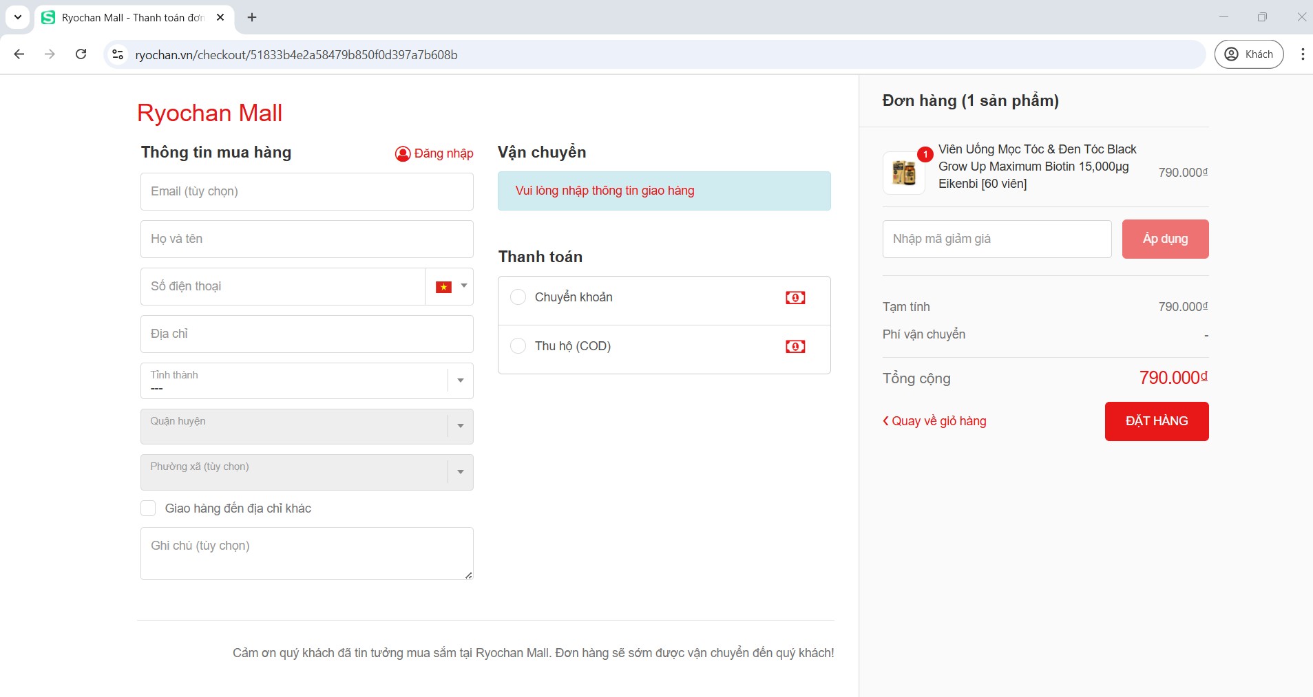 Quý khách điền đầy đủ thông tin của người nhận hàng như: Tên, Số điện thoại, Địa chỉ,... RYOCHAN MALL cam kết sẽ giữ bí mật thông tin cá nhân của quý khách.