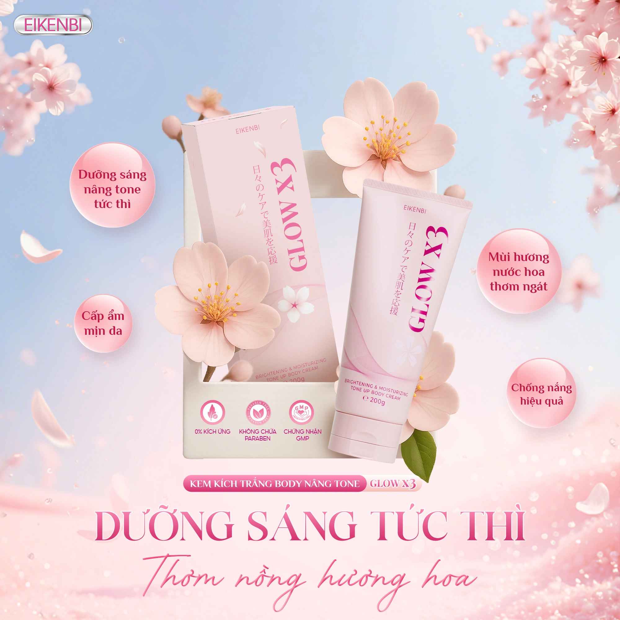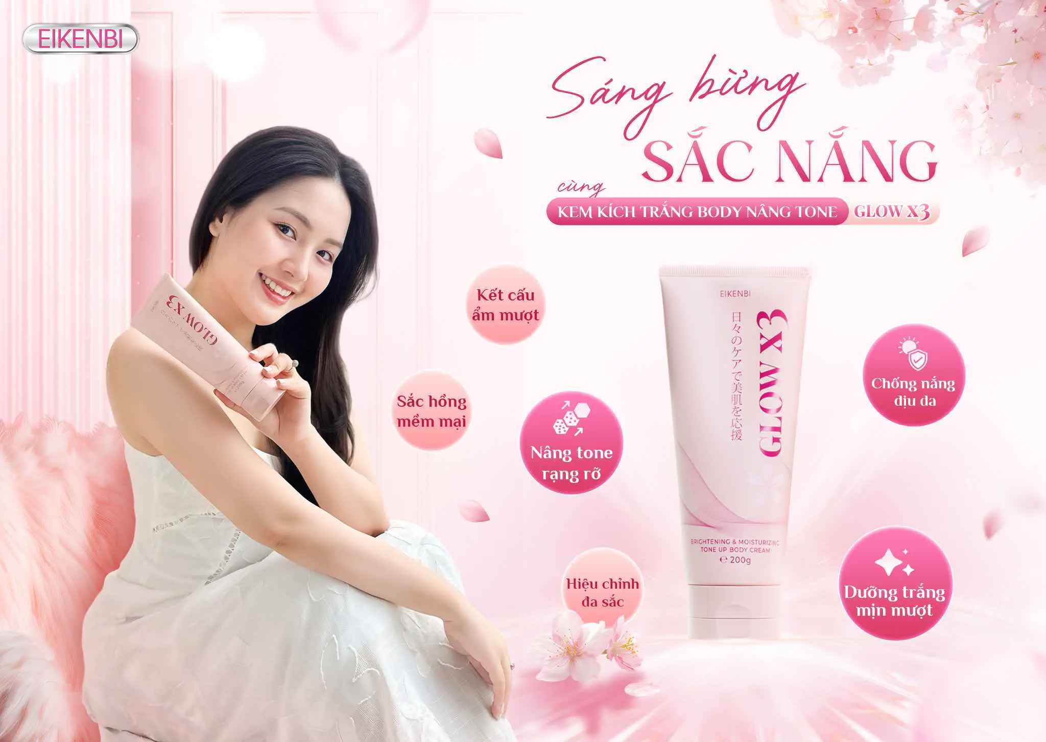Kem Body Dưỡng Trắng Nâng Tone Da Glow X3 Eikenbi với công thức đột phá chứa Niacinamide, Glutathione, Arbutin và các chiết xuất thiên nhiên cùng hương thơm thanh khiết từ hoa anh đào, sản phẩm giúp nuôi dưỡng làn da trắng mịn, đều màu, đồng thời nâng tone tức thì mà không gây bết dính hay trắng ảo.