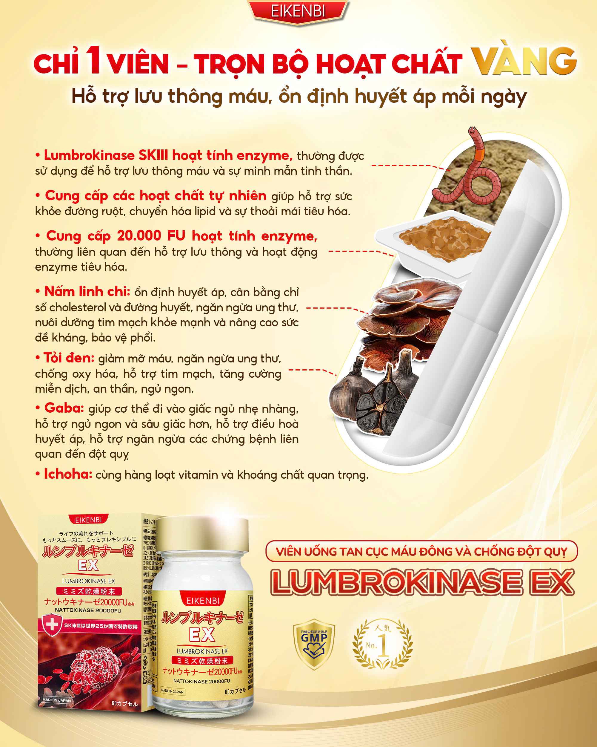 Viên Uống Tan Cục Máu Đông & Chống Đột Qụy Lumbrokinase Ex Eikenbi với công thức đột phá kết hợp Lumbrokinase SKIII với hàm lượng Nattokinase 20.000 FU cao cùng nhiều chất dinh dưỡng hỗ trợ khác. Sản phẩm góp phần làm sạch mạch máu, hỗ trợ làm tan các cục máu đông mới hình thành và lâu ngày, từ đó cải thiện lưu thông máu, giảm lipid máu và đặc biệt góp phần phòng ngừa nguy cơ đột quỵ, tai biến mạch máu não.